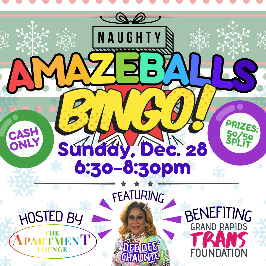Join us on the last Sunday of December for Naughty AMAZEBALLS BINGO at Apartment Lounge! Win CASH PRIZES playing bingo and instant games, while enjoying good drinks and good vibes! … ✨(Naughty) Amazeballs Bingo w/ DeeDee Chaunte✨ (21+) Read More »