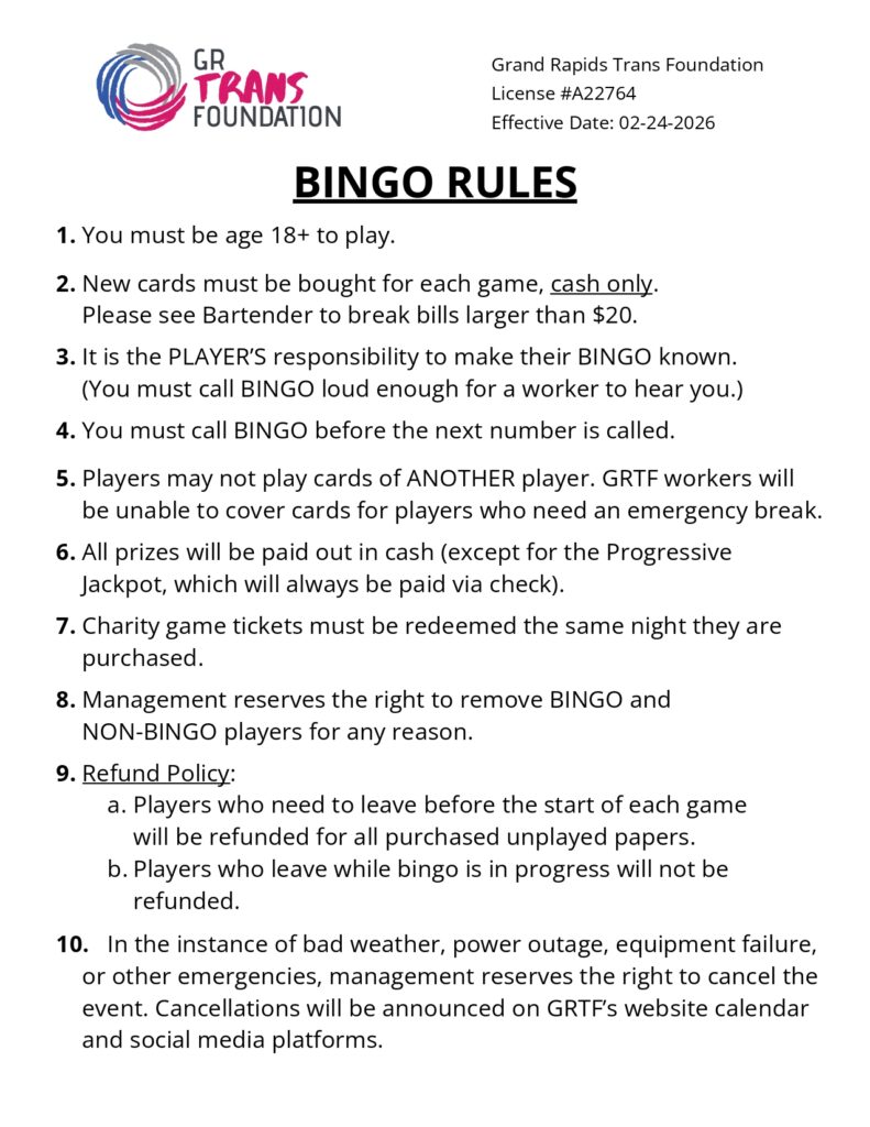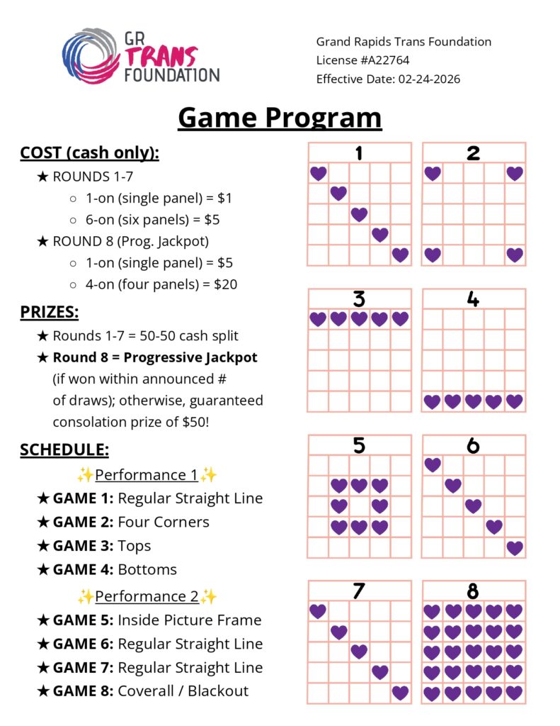 Join us on the last Sunday of every month at Apartment Lounge, for bingo, instant games, cash prizes, incredible drag performances, good drinks, and lots of fun! All proceeds go towards the affirming work of GR Trans Foundation. 🏳️⚧️