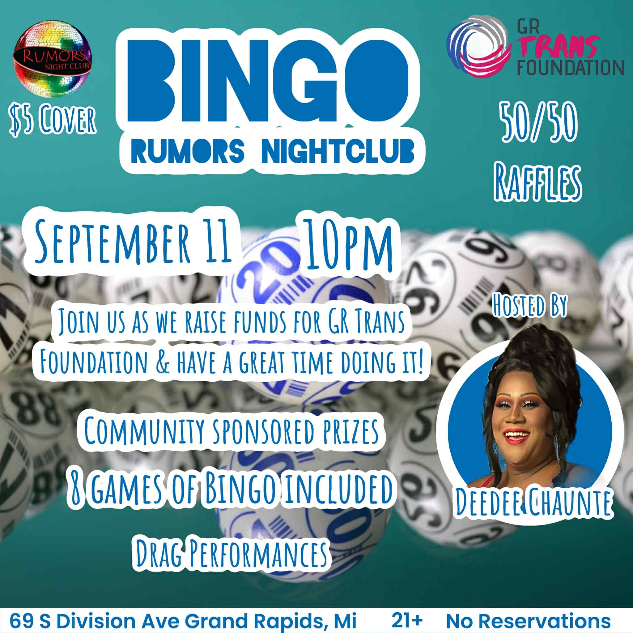 Bingo! Join us for this special event on Thursday, September 11th, to raise funds for the Grand Rapids Trans Foundation! A $5 cover gets you up to 8 rounds of bingo with community sponsored prizes! Drag performances by your host DeeDee Chaunte! Additionally, we'll have $1 instant games (with cash prizes up to $200) throughout …